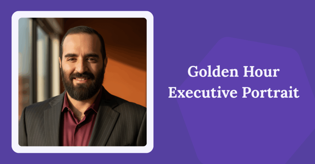 - “Create an extreme close-up professional headshot from the shoulders up of this exact confident business executive. The subject wears a rich burgundy silk shirt with a charcoal pinstripe blazer, complemented by subtle gold jewelry. Position against a warm gradient background transitioning from deep amber to burnt orange. Use natural golden hour lighting streaming through large windows, creating soft rim lighting on the hair and gentle shadows that sculpt the face. Capture with a 85mm lens at f/2.8 for sharp eyes with subtle background bokeh. Expression should be approachable yet commanding, with a slight confident smile and direct eye contact.”