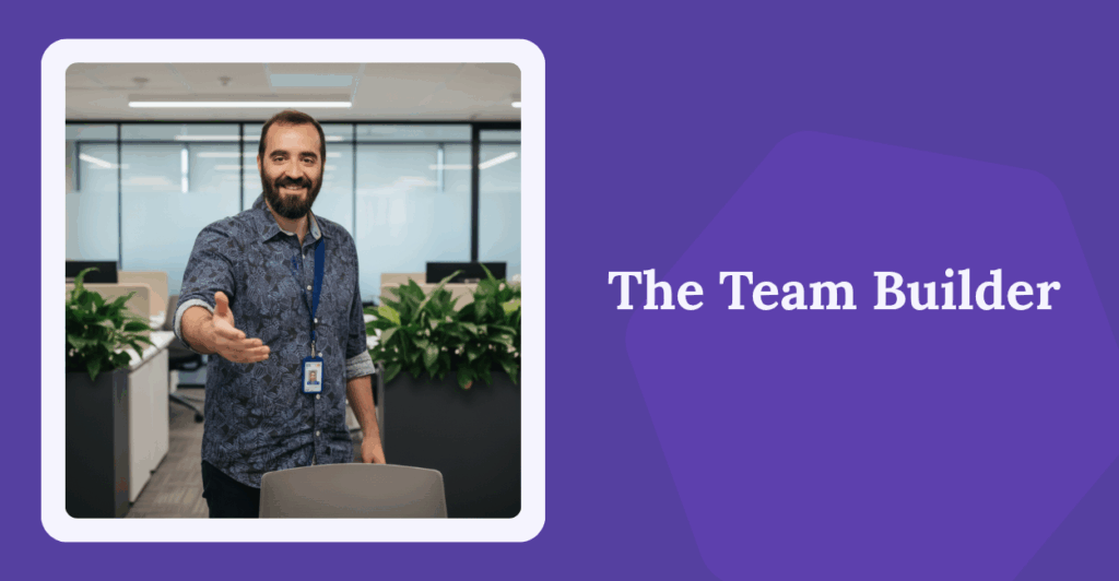 - “Have the person seated at the edge of a chair or standing with one hand extended as if offering a handshake or welcoming gesture. The other arm is relaxed at their side. Body language is open and inviting, with a genuine smile and direct eye contact. Posture suggests inclusivity and team-building skills while maintaining professional presence.”